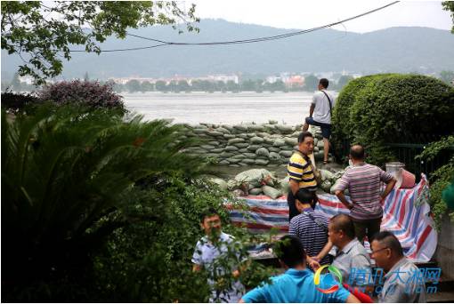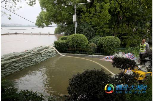 長沙湘江風(fēng)光帶,現(xiàn)場抗洪搶險工作人員在該沿線已筑約1米多高子堤,抵御洪水。