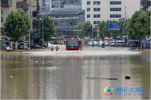 長沙西湖路,出現(xiàn)洪水倒灌,該路段及周邊部分街道已被淹,不少市民涉水出行。