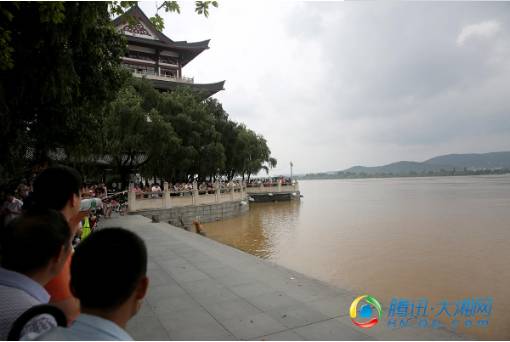 長沙杜甫江閣,原來的親水平臺被淹,湘江風(fēng)光帶沿線已筑子堤,抵御洪水。
