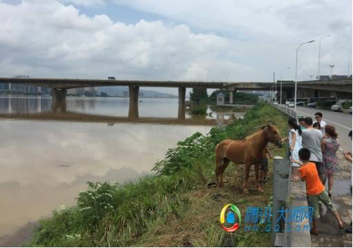 長沙湘府路大橋南,湘江水位呈上漲趨勢,江邊兩匹馬已無處可去,不少過往市民前來給它們喂食。