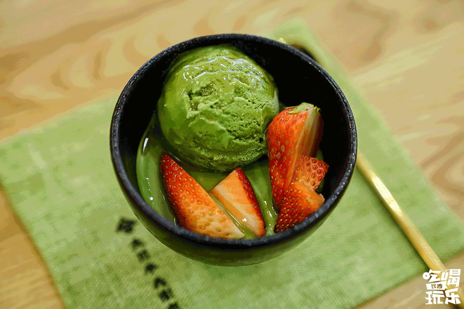 這也許是我見過顏值最高的“布丁”了吧!小碗內(nèi),擺放著一球抹茶冰淇淋和奶油草莓,顯得格外養(yǎng)眼。