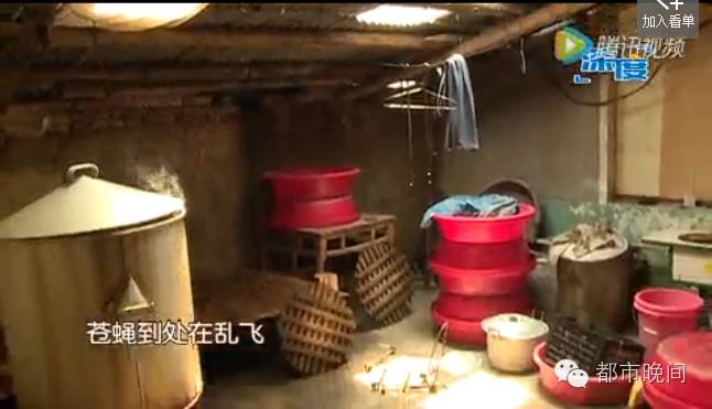 一名身穿藍色衣服的女子正在低頭忙碌包扎粽子,絲毫沒有顧忌盆子里的蒼蠅,在隔壁房間一個角落,一口大鍋引起了記者注意。