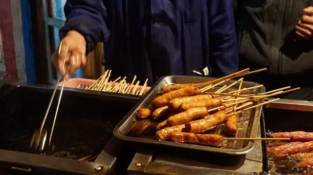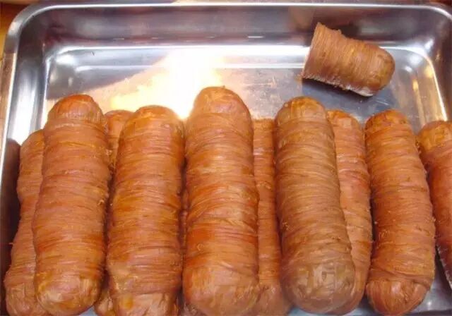冬瓜山香腸是那種類似于臘腸的形式,然后放進(jìn)滾燙的油鍋里炸的。兩口鍋炸,速度倒是很快,老板都是一箱一箱往底下加。雖然看上去感覺很一般,但是真心口感特別好,外皮很脆,里頭的肉質(zhì)被油炸開很有口感,奇怪的是居然一點(diǎn)不也油膩。