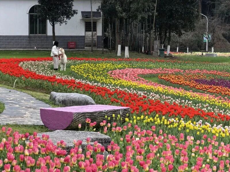 40萬株郁金香涵蓋多種花色,紅的、黃的、粉的、紫的錯落有致,與二月蘭、冰島虞美人交織成七色花田,搭配園區(qū)內(nèi)的霍比特小屋、秘境火車、童話城堡,仿佛闖入了荷蘭小鎮(zhèn)。最佳觀賞期為3月中上旬,花期持續(xù)至3月底,隨著氣溫升高,會有更多品種陸續(xù)綻放,賞花期充足。