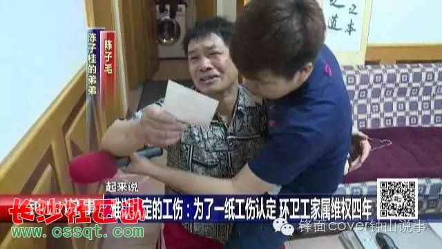 話說(shuō)益陽(yáng)的陳子桂,原本是長(zhǎng)沙市芙蓉區(qū)的一名環(huán)衛(wèi)工。2012年5月3日,當(dāng)他正在清掃馬路的時(shí)候,突發(fā)心肌梗塞后經(jīng)搶救無(wú)效離開了人世。按理說(shuō),在工作時(shí)間、工作地點(diǎn)身體出現(xiàn)了狀況,這理應(yīng)屬于工傷。但是,讓陳子桂的家人想不不明白的是:為了這一紙工傷認(rèn)定,陳子桂的弟弟陳子毛走上了為期四年的維權(quán)之路,至今仍沒(méi)有一個(gè)結(jié)果。