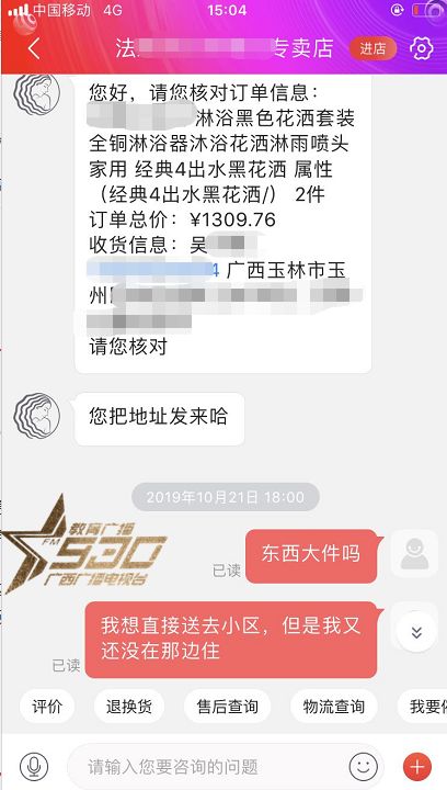 10月21日,玉林的吳女士在京東商城上的一家第三方店鋪購(gòu)買了一個(gè)花灑,賣家發(fā)的是圓通速遞。10月24日,物流信息顯示吳女士購(gòu)買的商品已經(jīng)到達(dá)玉林,但是一直沒有配送。