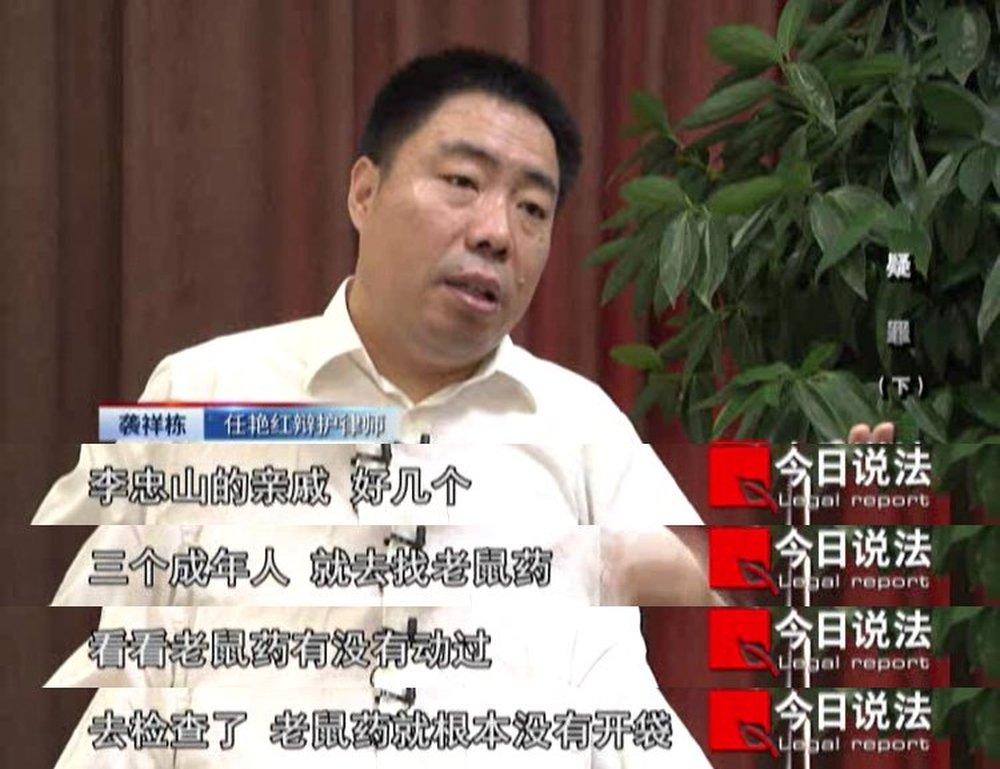 第一次,警方認(rèn)定,2010年8月,任艷紅將老鼠藥撒在了李忠山家的辣條上,導(dǎo)致他的兒子吃后出現(xiàn)中毒癥狀。但律師發(fā)現(xiàn),這一次的任艷紅,根本沒有作案時間。