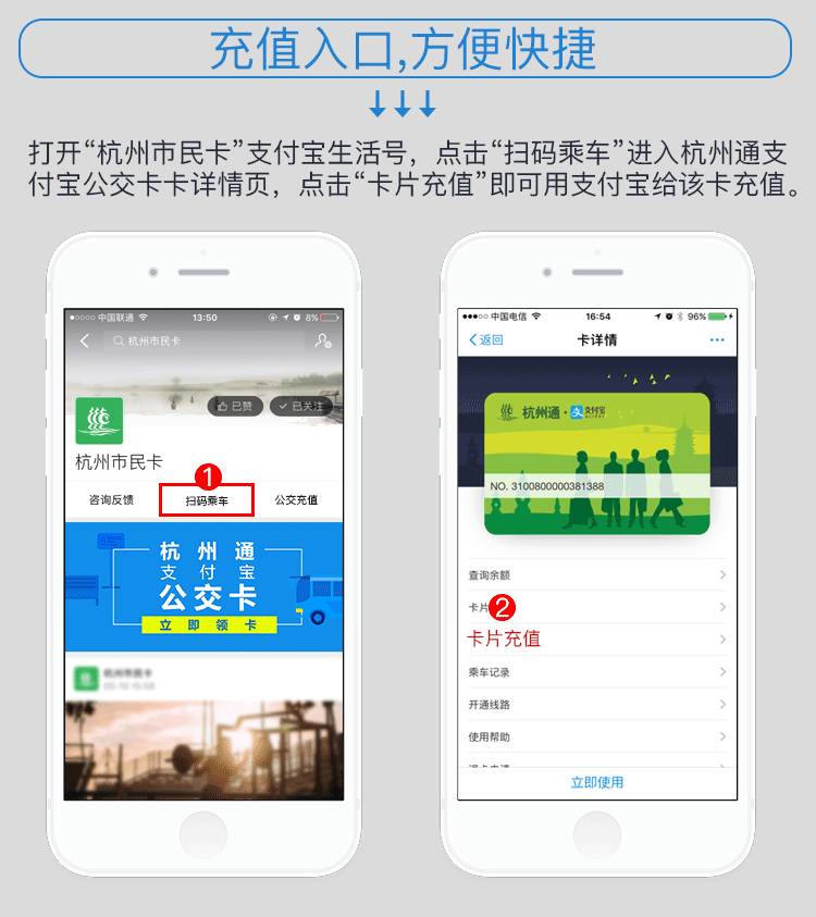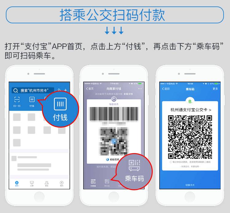 杭州公交推行的移動(dòng)支付包括了杭州通支付寶公交卡二維碼掃碼支付和銀聯(lián)云閃付,同時(shí)融合了現(xiàn)有的公交IC卡的刷卡支付,實(shí)現(xiàn)了一體機(jī)全支付。使用支付寶的乘客,打開杭州公交APP,點(diǎn)擊“支付",或打開支付寶首頁“付錢",頁面下方點(diǎn)擊“乘車碼",領(lǐng)取“杭州通支付寶公交卡"后,就能生成“杭州通支付寶公交卡"二維碼,對準(zhǔn)POS上方標(biāo)注有“支付寶&杭州市民卡"的掃碼付款區(qū),聽到“叮叮,請上車"的聲音即可;持有境內(nèi)外任一銀行發(fā)行的“62"字頭銀聯(lián)金融IC卡(芯片卡)或具有銀聯(lián)云閃付功能的手機(jī)、手表、手環(huán)的乘客,只需將銀聯(lián)金融IC卡或手機(jī)、手表、手環(huán)對準(zhǔn)POS機(jī)下方標(biāo)注有“銀聯(lián)云閃付"標(biāo)注的刷卡區(qū)一揮,聽到“叮咚,請上車"即可!
