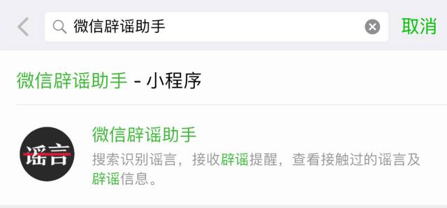 這個工具叫“微信辟謠助手”。在微信上方的搜索欄輸入“微信辟謠助手”,就會跳出這個小程序了,點擊它即可進入該工具界面。(本文轉自防騙大數(shù)據(jù):FPData)