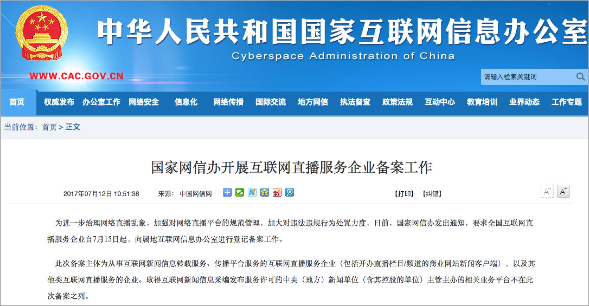 為進一步治理網(wǎng)絡(luò)直播亂象,加強對網(wǎng)絡(luò)直播平臺的規(guī)范管理,加大對違法違規(guī)行為處置力度,日前,國家網(wǎng)信辦發(fā)出通知,要求全國互聯(lián)網(wǎng)直播服務(wù)企業(yè)自7月15日起,向?qū)俚鼗ヂ?lián)網(wǎng)信息辦公室進行登記備案工作。