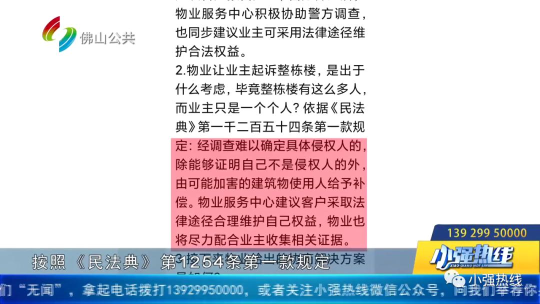 30萬奧迪新車落地, 不到3個月就被高空墜物 砸出一個大洞! 車主拒交物管費2年, 現在遭追繳拖欠的物管費。 2年前,就在南海桂城萬科金色領域3座樓下停車場,一覺醒來的潘小姐,就發(fā)現自己剛剛花31萬元買的奧迪Q3小車車頂被砸爛了。 從現場的情況來看,懷疑是有人扔了一個裝了褐色液體的玻璃瓶下來。 事發(fā)之后,潘小姐馬上報了警,也將情況反映給小區(qū)的物管。但結果就讓她更不開心了——物業(yè)公司讓潘小姐起訴樓上所有業(yè)主。 報保險后的修車費超過一萬元,潘小姐說她住的是公寓,一整棟樓有40層高,一共1200戶,當中有業(yè)主也有租客。要起訴這么多鄰居,對于她來說實在太困難。 潘小姐認為在這件事上,小區(qū)的物管也負有一定責任,收了物管費卻沒有做好管理,甚至沒有安裝攝像頭導致沒辦法抓到肇事者。 事后物業(yè)的態(tài)度也讓她火大,“起碼去調查樓上是不是有人扔東西下來,但是他們不作為!”,所以自此之后足足兩年時間,她都沒再交物管費。 上個月,小區(qū)物管再次向潘小姐發(fā)出物業(yè)費催繳通知,并提醒如果繼續(xù)不繳費,就要連滯納金一起追討。 潘小姐就認為,之前兩年欠繳的物管費,以及接下來兩年的物管費,都需要免了,作為對她的補償,“不是說交不起這兩年的不到3000元 物管費,我只是覺得物業(yè)要給我一個態(tài)度!” 對此,萬科金色領域的物管公司就回應,按照《民法典》第1254條第一款規(guī)定,經調查難以確定具體侵權人的,除了能夠證明不是侵權人的以外,由可能加害的建筑物使用人給予補償,意思也是叫潘小姐去告全棟樓的人,物業(yè)可以配合協助搜集相關證據。同時物管公司也愿意從客戶關懷角度,承擔潘小姐因報保險產生的跨年增長保費。 有律師就分析,法律上來說,確實很難認定物管公司在這件事上有過錯,“裝攝像頭是倡導性規(guī)定,沒有強制性義務!甭蓭煴硎,對于高空拋物,民法典做了相應明確的規(guī)定,對于受害者的保護力度是足夠大的。但同時,他也表示,在實際操作中,例如本次案例中公寓1000多住戶,確實比較難查清身份,起訴難度比較大。
