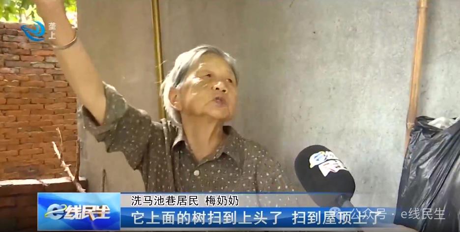 這棵樹(shù)你看這么大,樹(shù)枝經(jīng)常把房上的瓦掃下來(lái),那一邊全部都是小平房,住了好幾戶老人,都是七八十歲,有的還是單獨(dú)一個(gè)人住。我們也是五十多歲都退休了,在這里生活,你說(shuō)危不危險(xiǎn)。