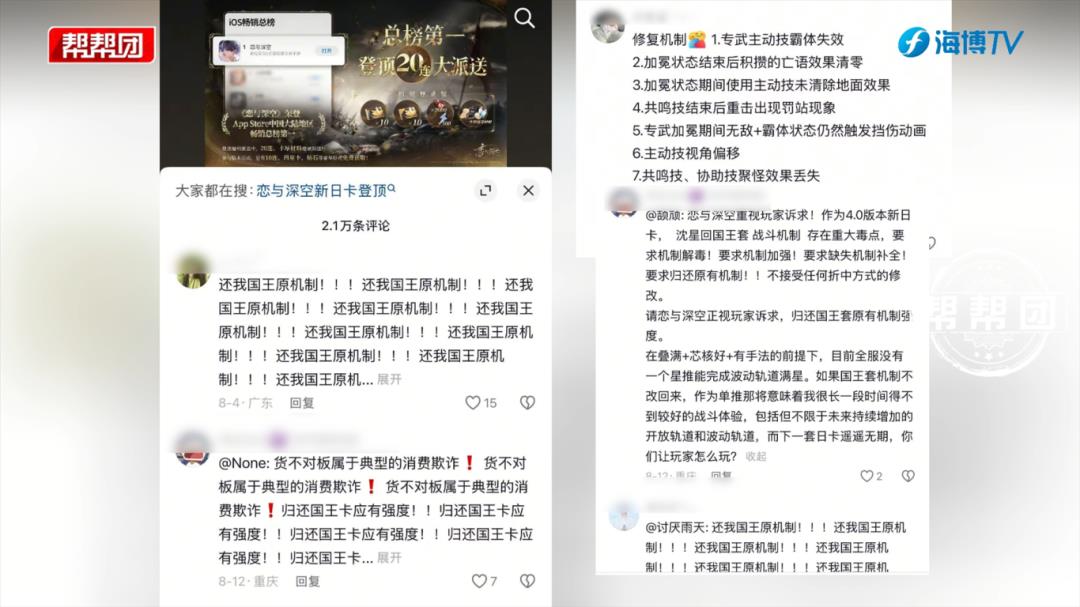 事后,游戲公司發(fā)布宣傳視頻稱,《戀與深空》在活動期間登上中國大陸蘋果商店暢銷總榜榜首。然而,視頻下方超過兩萬條的評論中,大量玩家要求官方兌現(xiàn)角色日卡最初的宣傳強度與機制。