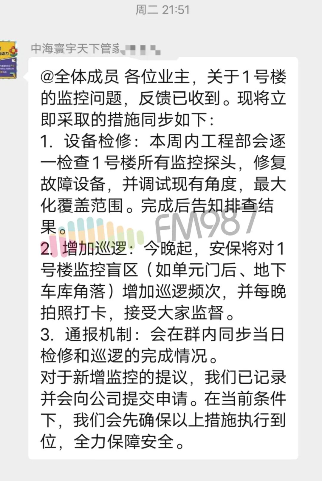 近日,家住福州中海寰宇天下小區(qū)的湯先生向《維權(quán)超給力》報料:他居住的一號樓監(jiān)控設(shè)施少,存在大量盲區(qū),導(dǎo)致樓內(nèi)盜竊案件頻發(fā),嚴(yán)重影響了居民們的日常生活。業(yè)主們多次向物業(yè)反映,但未見任何實質(zhì)性的改進(jìn)措施。 湯先生告訴記者,中海寰宇天下小區(qū)于2017年交房,他所居住的1號樓共34層,有一百多戶業(yè)主,但整棟樓的走廊和樓梯間都沒有安裝監(jiān)控探頭,地庫也只有主干道有監(jiān)控,存在很大的盲區(qū),電動車的電池、頭盔以及放在走廊的鞋子時常被偷。 (樓道里未安裝監(jiān)控) 今年8月,盜竊事件頻頻發(fā)生,引發(fā)了整棟樓業(yè)主對財產(chǎn)安全的擔(dān)憂。湯先生說,起初物業(yè)并不重視這個問題,大家在業(yè)主群里發(fā)聲后,物業(yè)管家才勉強在群里給出了回應(yīng):“物業(yè)將逐一檢查1號樓監(jiān)控設(shè)備并加強巡邏,每日往業(yè)主群匯報,對于新增監(jiān)控的提議,已記錄并向公司提交申請!钡珳壬J(rèn)為,這并不能從根本上解決問題。 保安再怎么巡查也不能24小時吧,最終解決的辦法是要加裝監(jiān)控,把現(xiàn)在的盲區(qū)覆蓋住。物業(yè)說已經(jīng)向公司提出申請新增監(jiān)控,具體什么時候能下來,誰知道呢? (物業(yè)管家在群里給業(yè)主的答復(fù)) 987《維權(quán)超給力》記者婷婷聯(lián)系中海物業(yè)福州分部,客服部一位工作人員回應(yīng)稱,地庫監(jiān)控只覆蓋主干道,是因為前期開發(fā)商交付時,地庫就沒有規(guī)劃非機動車停車區(qū)域,確實存在監(jiān)控盲區(qū)。業(yè)主反映電動車停放區(qū)域的盜竊事件,物業(yè)一方面是報備給屬地派出所,另一方面已經(jīng)加強安保巡邏,同時拍水印照片發(fā)到業(yè)主群。 1號樓地庫共有11個監(jiān)控,目前非機動車是停放在未售賣的停車位上和部分零星的角落。雖然沒有規(guī)劃停車區(qū)域,但不能說都不讓停。確實沒辦法覆蓋到每一個角落。 針對1號樓業(yè)主新增監(jiān)控的訴求,該工作人員表示,目前已經(jīng)將情況上報給公司,正在走申請的流程,具體什么時候能加裝需要等回復(fù)。 如果要加裝監(jiān)控,我們也是站在整個小區(qū)的情況去考慮,并不僅僅局限在某一棟樓。地庫加裝監(jiān)控也會優(yōu)先考慮集中充電區(qū)域。 針對此事,《維權(quán)超給力》特約律師、北京大成(福州)律師事務(wù)所高級合伙人周林律師認(rèn)為,業(yè)主要求新增監(jiān)控的訴求相對合理,物業(yè)有安保方面的職責(zé)和職能。目前存在盜竊高發(fā)的情況,物業(yè)有義務(wù)提高安保的防范措施。 一是物業(yè)公司需要盡快拿出相應(yīng)方案,由誰來出錢新增監(jiān)控;二是成立業(yè)委會,業(yè)委會可以通過物業(yè)費盈利的部分來對小區(qū)的硬件設(shè)施進(jìn)行全方位的升級。這兩種方案都是比較快速能解決實際問題。 此事的后續(xù)進(jìn)展,《維權(quán)超給力》將持續(xù)關(guān)注!987私家車廣播,贊5