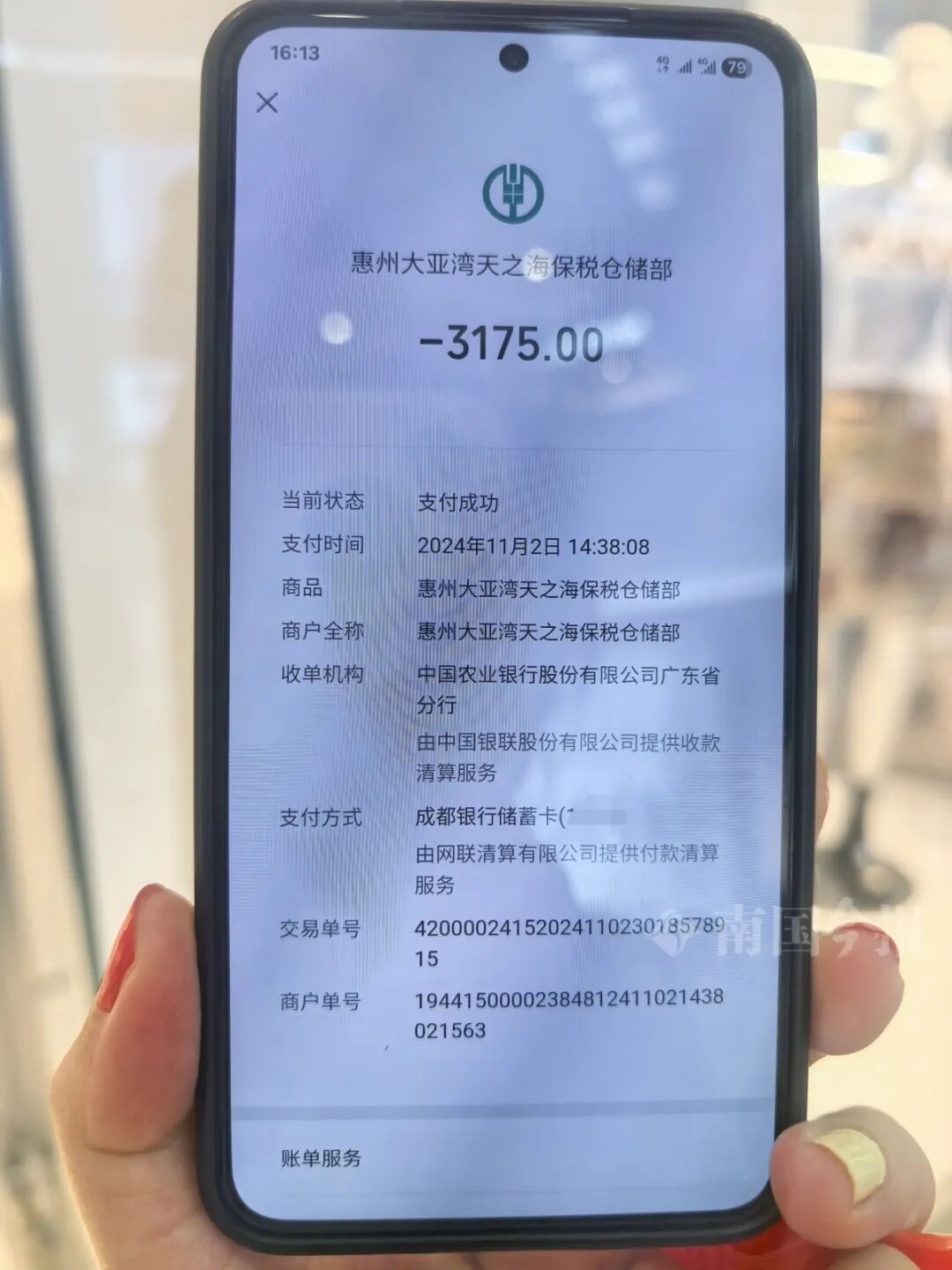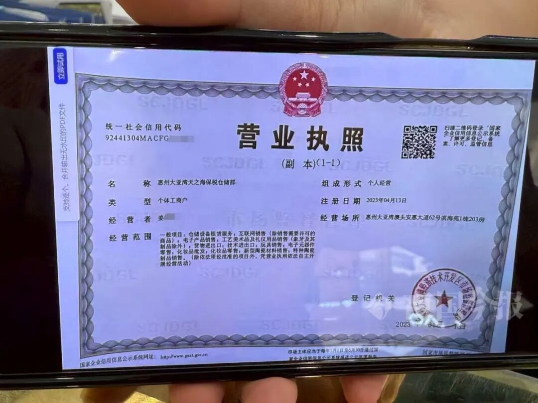 周女士前往城中萬(wàn)達(dá)服務(wù)臺(tái),要求店家提供營(yíng)業(yè)執(zhí)照。執(zhí)照顯示,店鋪名稱為“惠州大亞灣天之海保稅倉(cāng)儲(chǔ)部”,經(jīng)營(yíng)場(chǎng)所位于“惠州大亞灣澳頭安惠大道62號(hào)濱海苑1棟203房”。