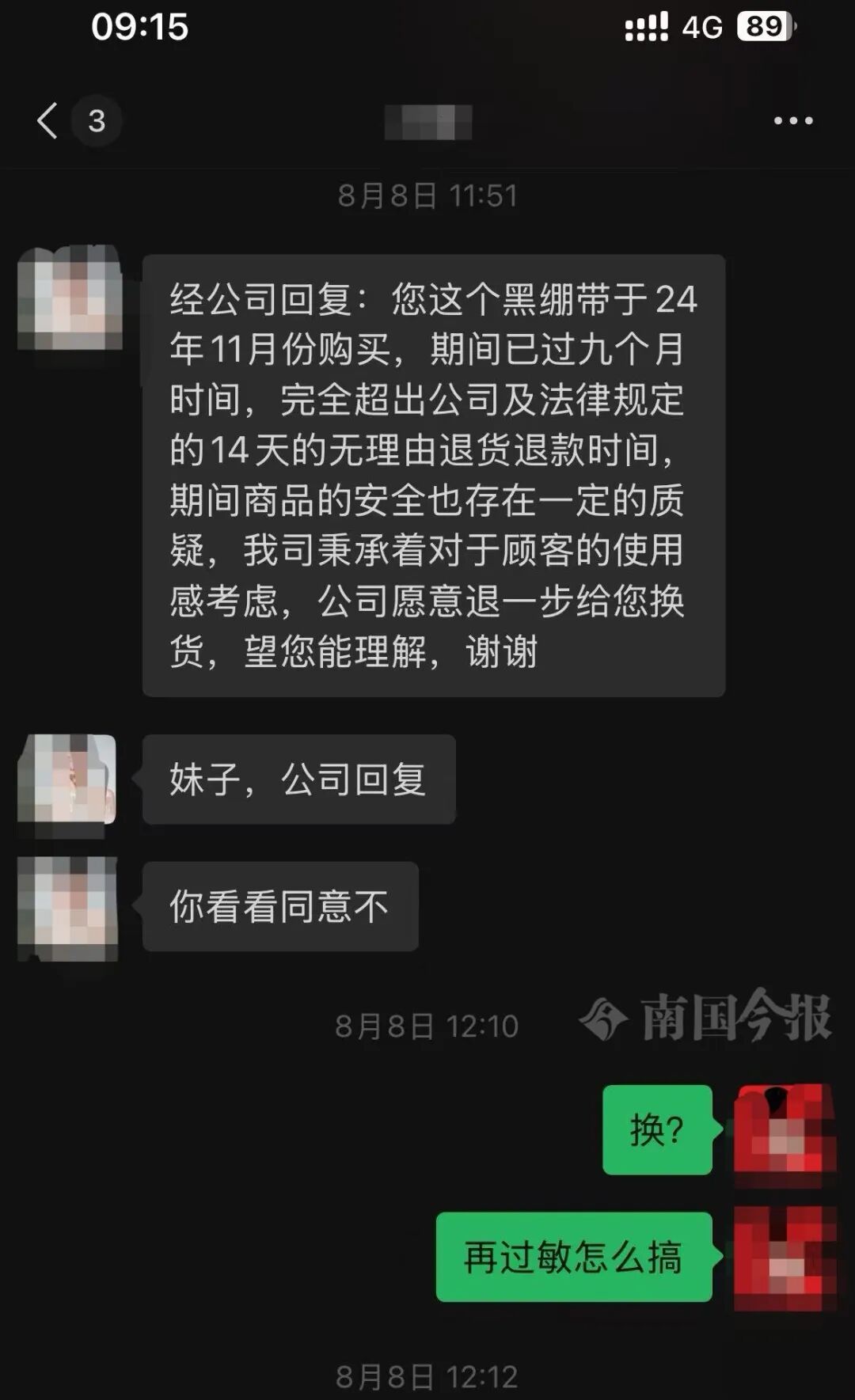 今年8月,周女士拿出這瓶面霜使用,結(jié)果剛使用第一次,臉部皮膚就泛紅和過(guò)敏。周女士拿著產(chǎn)品找店家退貨,店家表示周女士這個(gè)黑繃帶面霜是2024年11月購(gòu)買,其間已過(guò)9個(gè)月時(shí)間,完全超出公司及法律規(guī)定的14天無(wú)理由退換貨時(shí)間,公司不能退貨,只給換貨。