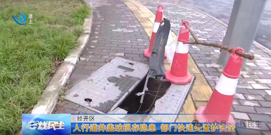 我們接到反饋之后,第一時間到現(xiàn)場進(jìn)行核實(shí),放置錐桶,保障行人的安全。其實(shí)這個地方在今年3月中旬的時候,我們就已經(jīng)更換過,然后這個井蓋是滿足設(shè)計和國家規(guī)范要求的,是保障行人的正常出行,它是一個負(fù)荷井蓋,可能由于有一些重物對它進(jìn)行了碾壓,就造成了這個井蓋的破損。