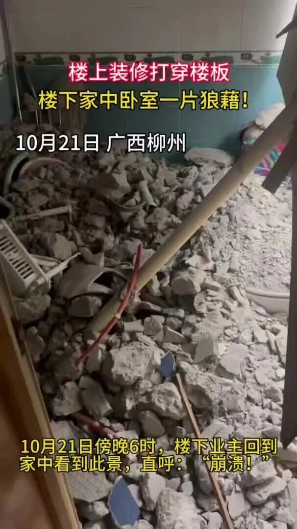 “雙層鋼筋被剪斷,20厘米厚的混凝土被砸爛,他們怎么能這樣裝修!”10月21日下午6時許,業(yè)主王女士回到魚峰區(qū)京港路晶遠花苑小區(qū)的家中時,被眼前一幕氣得不行——樓上裝修導致樓板坍塌,她的臥室衛(wèi)生間宛如一片“廢墟”,多處墻面還有開裂、漏水的情況,這是怎么回事呢?
