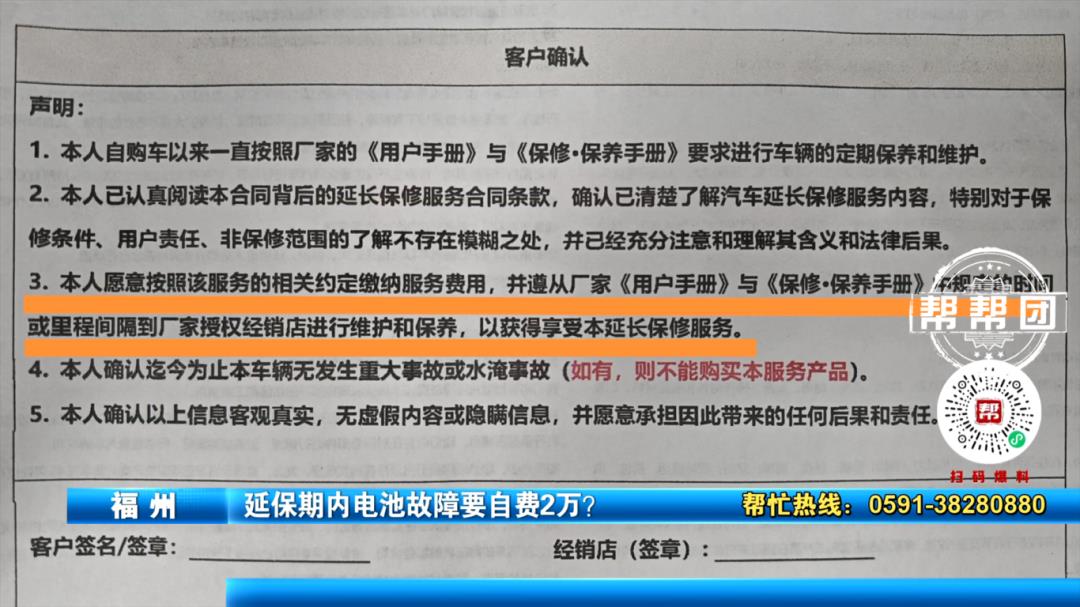 福州的林女士兩年前購買了一輛廣汽埃安SPLUS新能源車,當(dāng)時,她還購買了延保服務(wù)。最近,車輛電池出現(xiàn)了問題,但4S店卻以“保養(yǎng)記錄缺失”為由拒絕履行延保責(zé)任。 電池故障后遭拒保 車主稱“保養(yǎng)僅延后未缺失” 針對 4S 店“保養(yǎng)缺失”的說法,林女士表示無法接受。她稱購車兩年多來,所有保養(yǎng)均在該4S店完成,僅部分保養(yǎng)里程略有延后,并非“完全缺失”。 記者現(xiàn)場比對4S店標(biāo)注的“缺失保養(yǎng)項”與林女士的實際保養(yǎng)記錄發(fā)現(xiàn),數(shù)值均在合理里程區(qū)間內(nèi),僅未完全滿足“整數(shù)里程保養(yǎng)”的標(biāo)注要求。 4S店以“合同條款”為由拒保 車主質(zhì)疑“未獲知情權(quán)” 為核實情況,記者與林女士一同前往涉事4S店。在維修車間,林女士的故障車輛仍處于待修狀態(tài)——因保修爭議未解決,4S店暫未開展維修。隨后,記者與4S店售后經(jīng)理林某溝通,對方明確了拒保的三點理由。 林經(jīng)理向記者出示了《汽車延長保修服務(wù)合同》,其中“客戶確認(rèn)”欄第三條載明:“本人自愿遵從廠家《用戶手冊》與《保修保養(yǎng)手冊》中規(guī)定的時間或里程間隔,到廠家授權(quán)經(jīng)銷店進行維護保養(yǎng),方可享受本延長保修服務(wù)”。但林女士強調(diào),簽約時僅簽署了姓名,未收到合同原件,也未被告知該條款內(nèi)容。 官方客服介入核實 雙方達成和解方案 因現(xiàn)場未核查到完整簽約記錄,且4S店與林女士就維修責(zé)任無法達成一致,記者隨后撥打廣汽埃安官方客服熱線,反饋林女士的情況及4S店可能存在的“未履行告知義務(wù)”問題。 當(dāng)天下午,廣汽埃安官方客服與4S店核實了林女士購車以及購買延保的具體情況,確認(rèn)銷售顧問在銷售過程中存在程序缺失的情況,并與林女士協(xié)商和解。 4S店售后林經(jīng)理 協(xié)商結(jié)果是,林女士支付5000元維修費,4S店幫她修好后,再為她提供一年2萬公里的質(zhì)保,然后讓銷售顧問把3500元延保費用退給林女士,之后延保合同終止。 購買延保服務(wù)時,要妥善保管延保合同、購買憑證、溝通記錄等相關(guān)材料,在簽訂延保合同時,務(wù)必仔細閱讀條款,特別是保養(yǎng)周期、地點、項目以及違約責(zé)任等規(guī)定。如果遇到糾紛可以通過協(xié)商、投訴等方式尋求和解,或者通過法律手段維護合法權(quán)益。