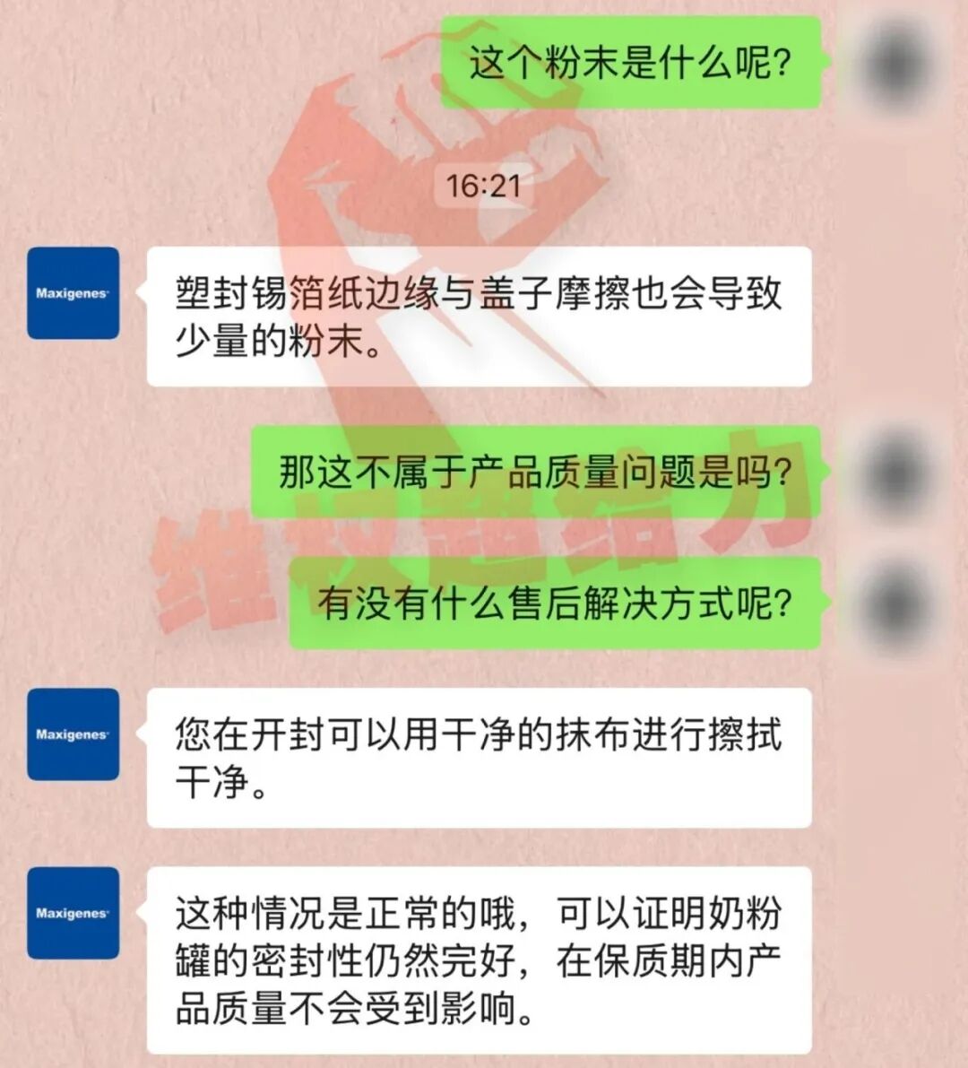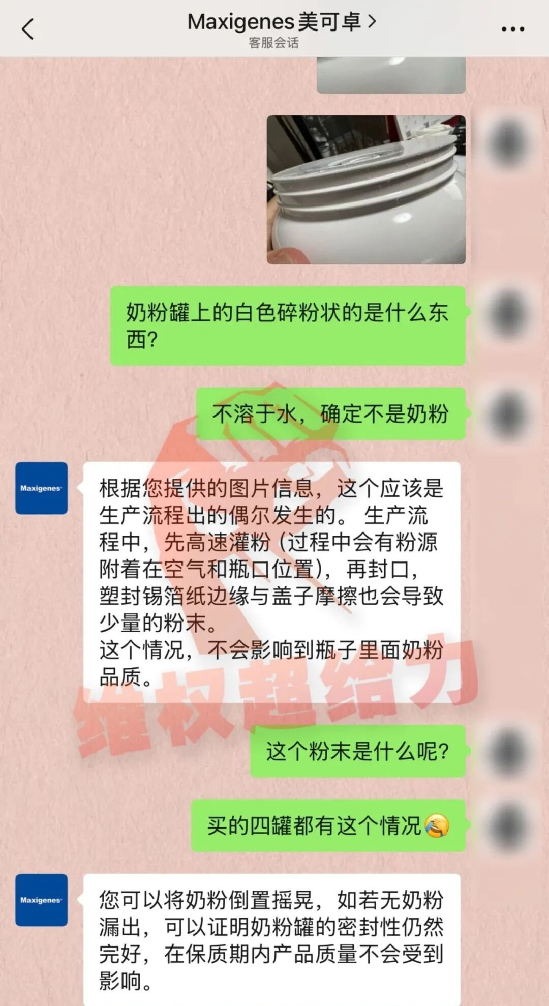 “奶粉生產(chǎn)環(huán)節(jié)均在真空車間進(jìn)行,不可能出現(xiàn)不明粉末。此前從未收到過(guò)類似投訴。消費(fèi)者可以將圖片發(fā)送至品牌公眾號(hào)的人工客服,以便進(jìn)一步核實(shí)物質(zhì)成分!