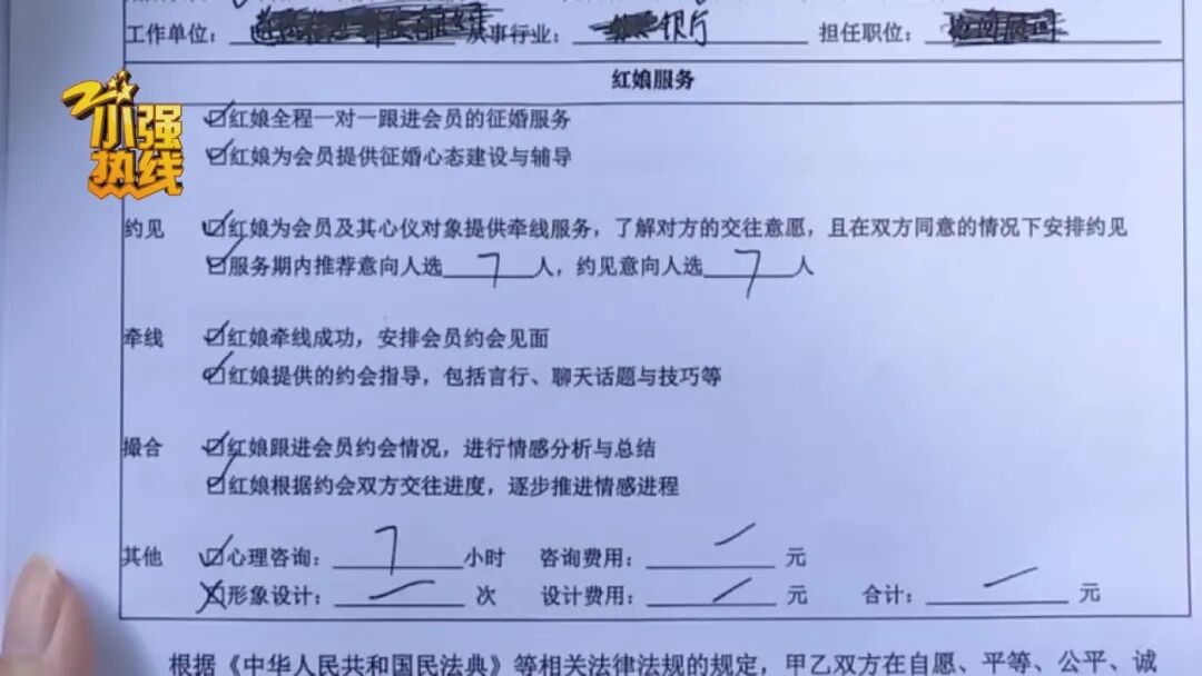 于是邵女士支付了近5萬元費用,簽訂了會員服務合同。之后公司給他推薦了幾位男嘉賓,條件都還比較符合,可惜都沒能成功。邵女士說公司這時候要求她升級會員,“他說我長這么好看結不了婚,其實兩個原因,第一點原因是不懂男性思維,第二點覺得我的層次不夠,他說我的會員,雖然交的費用也是比較高,但在他這只是一個普通會員,需要升級一下,他會給我提供戀商愛商全方位提升的會員,還承諾所有約見的男生都是不低于繳納10萬元會費的嘉賓!