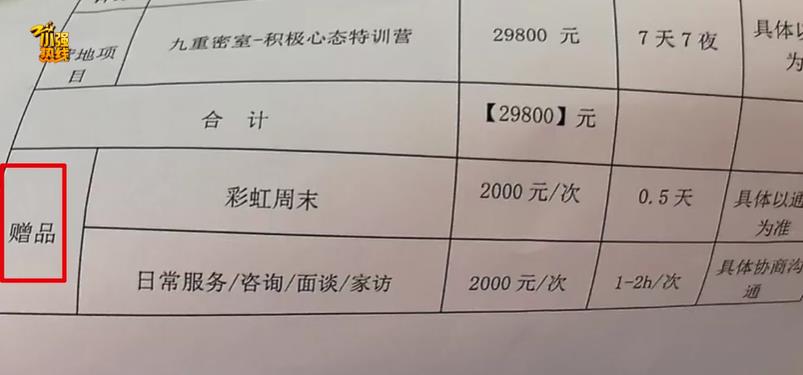 對(duì)于黃女士的訴求,機(jī)構(gòu)表示要扣除1萬(wàn)元。查看合同,里面有兩個(gè)贈(zèng)送項(xiàng)目:“彩虹周末”和日常服務(wù)咨詢,均標(biāo)注“2000元/次”。