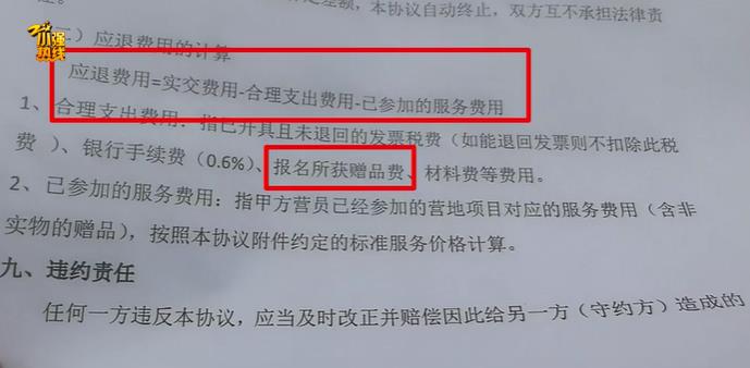 關(guān)于退費(fèi),負(fù)責(zé)人解釋:“如果提出退款,相當(dāng)于她是違約方,所有享受的免費(fèi)服務(wù)我們要按價(jià)收費(fèi)。” 合同確實(shí)將贈(zèng)品費(fèi)用納入退費(fèi)計(jì)算。