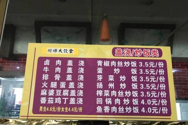 川師大的食堂不僅價格便宜,還根據(jù)男生和女生的不同飯量分開來計算。一份蓋澆飯,男生4.6元,女生只要4.4元。