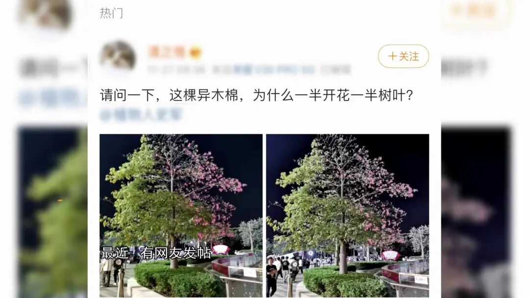 十一月的廣東 秋冬景色更勝春朝 最近有網(wǎng)友發(fā)帖說 在廣州市兒童公園對面的一個廣場上 發(fā)現(xiàn)了一棵“神奇”的木棉樹 據(jù)說樹上兩極分化、半紅半綠 真有這么神奇嗎? 這顆樹以樹干為中軸線 左邊開滿粉粉嫩嫩的花兒 相反右手邊 看上去黃黃綠綠,一花未開 仿佛這棵樹的兩邊 跨越了不同的季節(jié) 大腹木棉,屬于珍稀景觀綠化樹種其樹干膨大形似“大肚能容、笑口常開”的彌勒佛因而又別稱“彌勒佛樹”,也被叫做“酒瓶木棉”。 半紅半綠 相映成趣,天然吸睛 無論從哪個角度觀看 都自成一道靚麗風景 這次這棵特別的異木棉 也引來了還不少街坊駐足拍照 什么這棵“大腹木棉”會長成這個樣子呢? 在網(wǎng)友的帖子下面 有科普博主回應稱 是因為右側(cè)下沉廣場的氣流影響 兩側(cè)溫度有差別才能有如此奇景 對此“特搜”也特意聯(lián)系了植物學家 專家表示造成這種情況 可能有很多因素 需要實地考察才能下定論