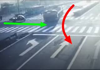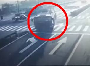 眼看著可能會(huì)撞上正在左轉(zhuǎn)的電動(dòng)三輪車,肇事的重型平板車司機(jī)一把方向往左打去,成功避開了電動(dòng)三輪車。