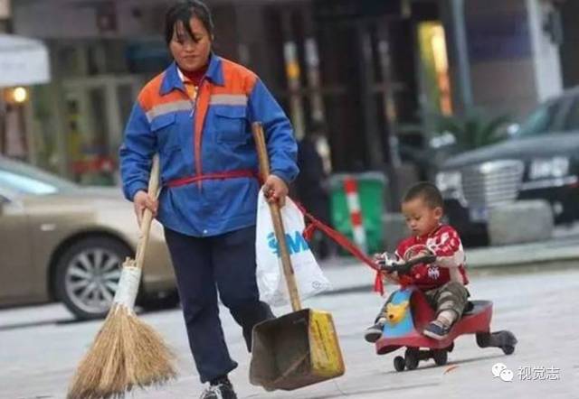 ▼城市街道,一位環(huán)衛(wèi)工媽媽帶著自己的孩子在街頭打掃衛(wèi)生。