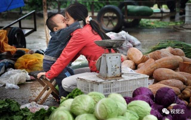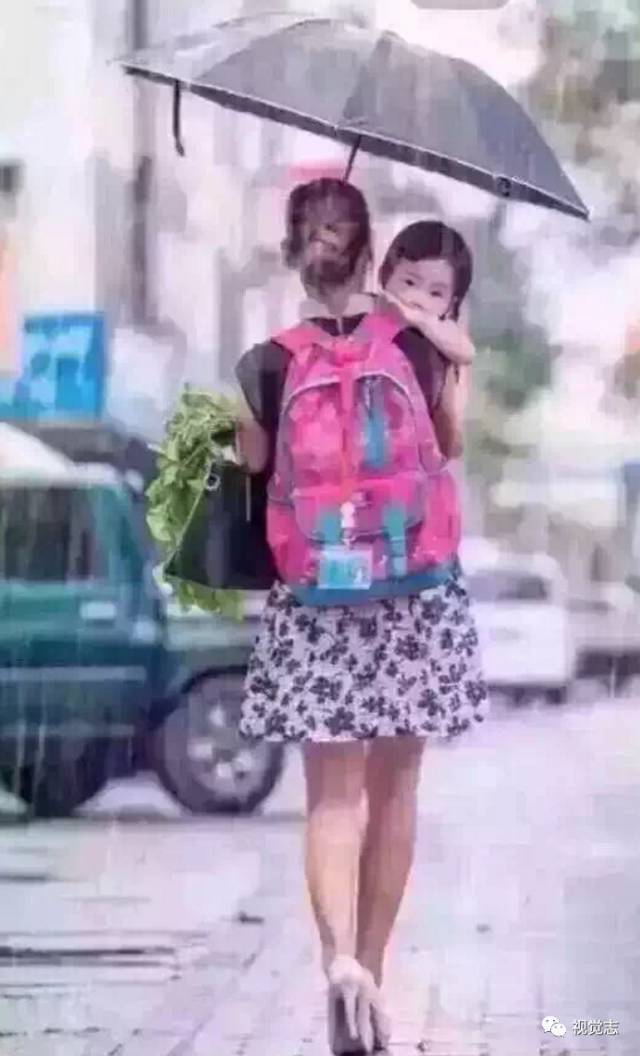 ▼雨中年輕的媽媽,右手抱娃,左手撐傘,背上背著書包,胳膊上挎著自己的包,還有剛買的蔬菜。