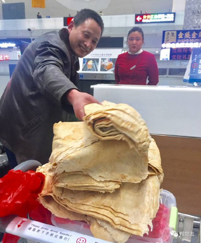 ▼2017年大年初六,南京祿口機場,一位男子因帶了太多老母親做的煎餅,導(dǎo)致行李超重30多斤。