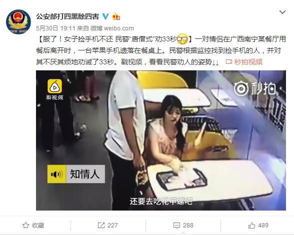 一對情侶在廣西南寧某餐廳用餐后離開時,一臺蘋果手機遺落在餐桌上。民警根據(jù)監(jiān)控找到撿手機的人,并對其不厭其煩地勸誡了33秒。 戳視頻,看看民警勸人的姿勢↓↓ 這件事,在微博上引發(fā)了熱烈的討論。 來,一起看看這個過程。 當事情侶在餐廳用完餐準備離開。 手機就這樣落在桌子上了。 手機被另外一名顧客看到。 民警通過監(jiān)控找到拿手機的人后,巴拉巴拉勸解。給警察蜀黍一個大寫的贊! 這讓早報君想起, 今年5月初, 南寧一男子在地鐵內(nèi)撿到手機, 為了逃避監(jiān)控, 上演各種套路。 也是醉了! 相關(guān)鏈接 一男子撿到他人手機后, 上演各種套路… 5月9日, 廣西南寧地鐵站, 一名女子購票時遺落手機。 一白衣男子撿到后, 為將手機占為己有, 又是躲監(jiān)控, 又是換乘, 上演各種套路。 ▲監(jiān)控視頻。 最近廣西區(qū)內(nèi)發(fā)生的 幾起拾起失物的事件, 都很有意思。 拾到失物的人, 做法各不相同, 結(jié)果也都很出乎意料。 廣西一小伙拾金不昧 反被戴手銬 4月29日, 柳州小伙楊先生 在柳州河西建材園 撿到了一個女式挎包, 隨即打電話通知失主來領(lǐng)。 沒想到, 楊先生卻被跟著 失主而來的民警銬了起來。 “好人”變成了“嫌疑人”, 楊先生表示很憋屈。 了解詳情請點擊▼ 什么鬼?廣西一小伙拾金不昧反被戴手銬!警察回應(yīng):無不妥 其中一名姓廖的工作人員解釋,因為那個挎包是有人報警失竊了的,公安機關(guān)已經(jīng)立案,包已屬贓物,在未調(diào)查清楚之前,扯上關(guān)系的人都可能有嫌疑。 廖同時建議市民,路上撿到東西,最好撥打110報警處理,可省卻很多麻煩。 撿到失物取走5000元酬金, 算敲詐嗎? 4月20日中午12時多, 在南寧一家銀行, 一名女士遺落一個背包, 銀行監(jiān)控視頻記錄一男子將包帶走。 其后,失主聯(lián)系撿包男子,提出拿1000元作為報酬請對方歸還財物,最終男子從失主的銀行卡內(nèi)取出5000元后寄回物品。 案件承辦人、西鄉(xiāng)塘區(qū)檢察院副檢察長秦燕介紹,秦燕提醒,若丟失財物,不要直接與拾撿人談條件,而應(yīng)主動報警。