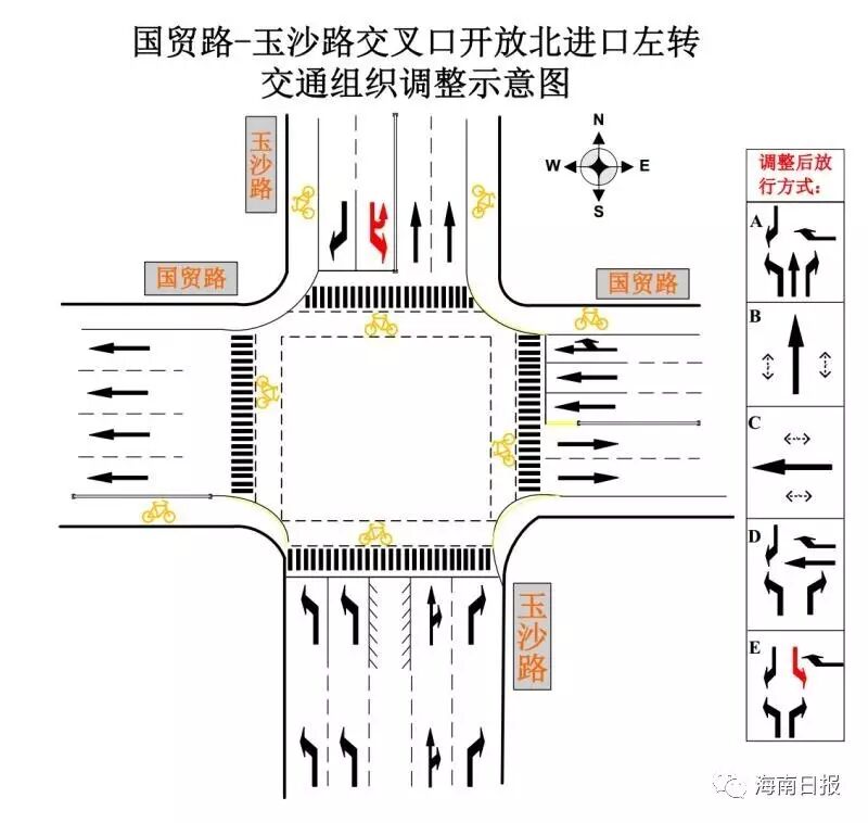 為進(jìn)一步提升國(guó)貿(mào)路與玉沙路交叉口的通行能力,方便市民出行,充分發(fā)揮國(guó)貿(mào)路周邊路網(wǎng)的分流作用,結(jié)合路口交通管理實(shí)際需求,6月12日,海口市公安局交通警察支隊(duì)已正式開放國(guó)貿(mào)路與玉沙路交叉口北進(jìn)口左轉(zhuǎn),目前,車道渠化及信號(hào)燈放行方式調(diào)整工作已全部完成。