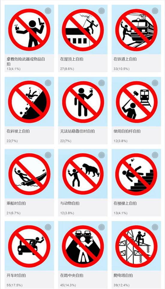 據(jù)美國(guó)一項(xiàng)研究顯示,截至去年8月,全球自拍致死案例達(dá)127例,其中中國(guó)5起。“自拍死”最常見(jiàn)的原因是從高處摔下,其次是溺斃。去年前8月的死亡案例更是超過(guò)了過(guò)去兩年之和,自拍致死受害者中,平均年齡為21歲,76%死者為男性。