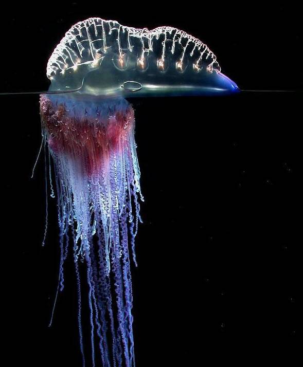 僧帽水母(Physalia physalis)在水面上漂浮的淡藍(lán)色透明囊狀浮囊體,前端尖、后端鈍圓,頂端聳起呈背峰狀,形狀頗似出家修行僧侶的帽子,故取名僧帽水母。因其囊狀部分酷似16世紀(jì)的葡萄牙戰(zhàn)艦,又被稱葡萄牙軍艦水母(Portuguese Man-of-War)。