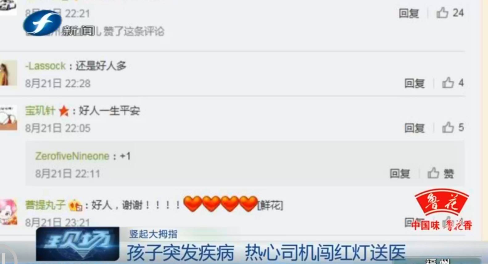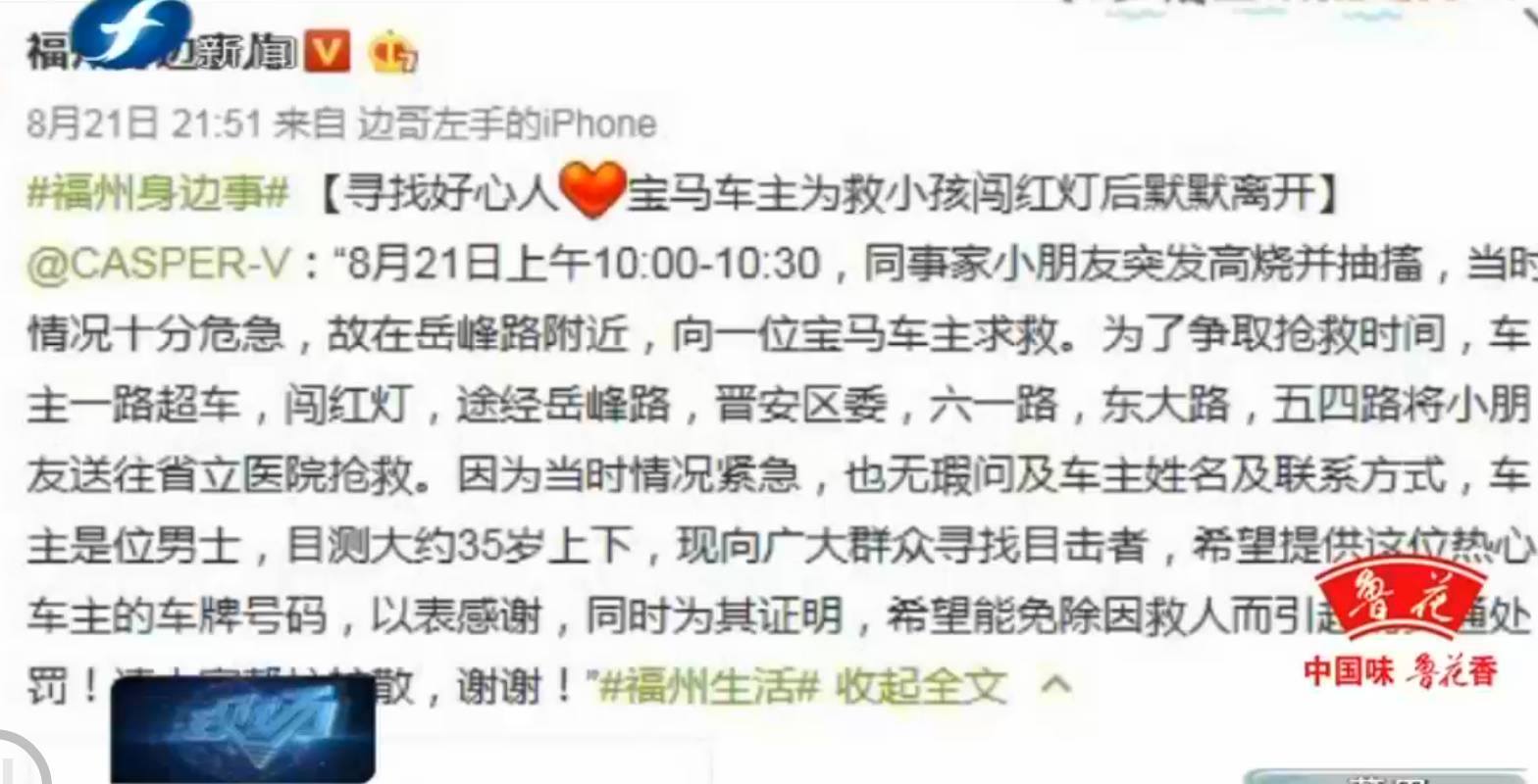 網(wǎng)友在微博上說,21日上午小朋友突發(fā)高燒并抽搐,家屬向一位私家車主求助后,為爭取搶救時間,車主一路超車闖紅燈,將小孩送往醫(yī)院搶救。