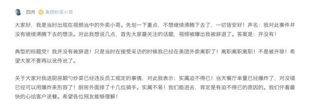 外賣小哥15日回應(yīng)稱,自己并不是因“進(jìn)后廚炒菜”而被辭退,是正常離職。并希望廣大網(wǎng)友不要再以訛傳訛。