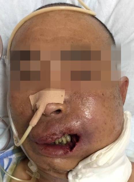 “患者姓張(化名),50歲,家住嘉興,半個(gè)多月前急診轉(zhuǎn)到我們醫(yī)院的,來的時(shí)候情況很兇險(xiǎn),整張臉基本上都是腫的,尤其是眼瞼部、嘴巴,張口受限,已經(jīng)不能自主呼吸,高熱,有39.5℃!闭愦笠辉嚎谇豢聘敝魅瓮魢A主任醫(yī)師說。
