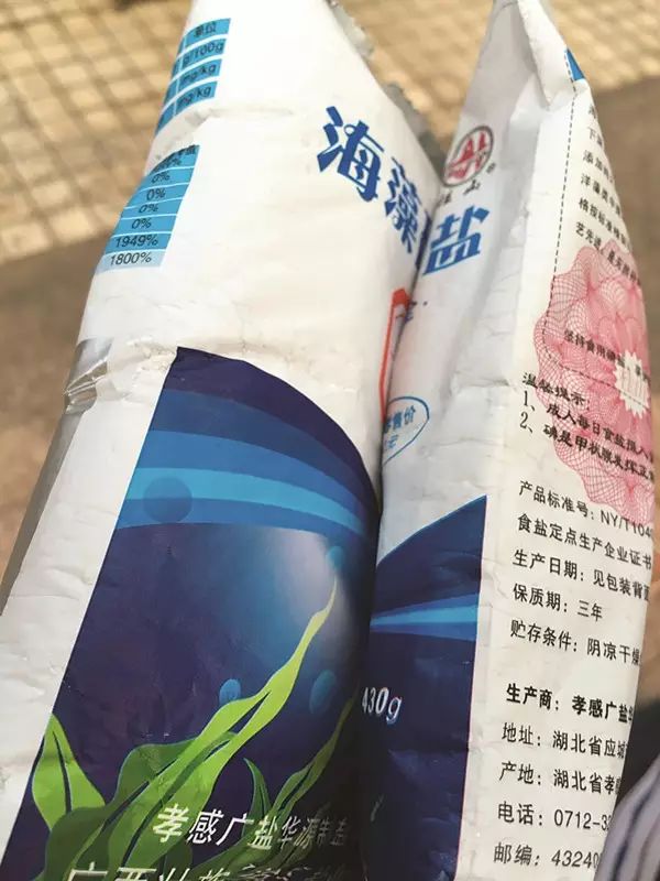 真碘鹽袋子上的標(biāo)識都工工整整地貼在同一個位置,而假碘鹽袋子上的標(biāo)識粘貼的明顯不規(guī)范。