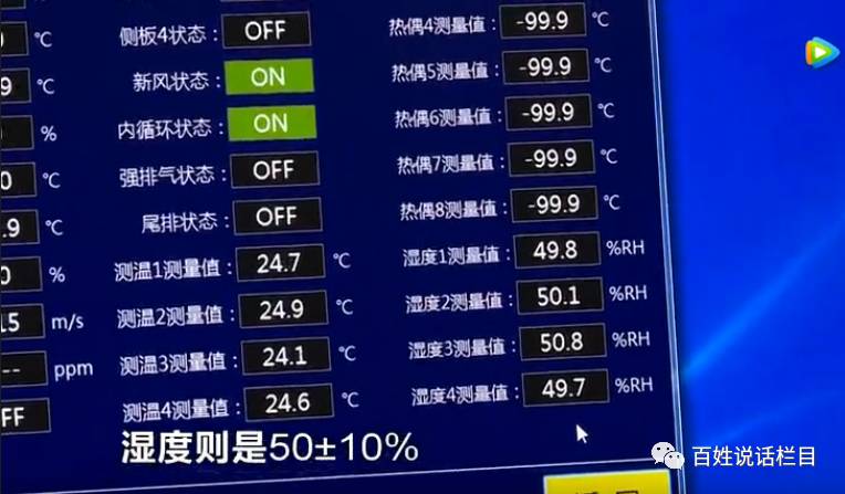 檢測人員:在這里,我們可以看到整個(gè)艙內(nèi)幾個(gè)監(jiān)控點(diǎn)的溫度和濕度情況,國標(biāo)中規(guī)定,整個(gè)環(huán)境溫度,必須控制在25°±1°,而濕度在50加減10%的范圍內(nèi)。