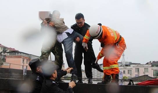 經(jīng)過30多分鐘的對峙,該老人情緒一直激動(dòng),同時(shí)雨越下越大,屋頂邊緣非常濕滑,該老人也全身濕透,精神開始疲憊,隨時(shí)有墜樓的危險(xiǎn),F(xiàn)場從該老人后方上去需要翻越2米多高的高臺,加之該老人一見到身穿制服的救援人員就特別激動(dòng),不準(zhǔn)他們靠近并聲稱要跳下去。李洪波隊(duì)長只得脫下?lián)岆U(xiǎn)救援服,更換迷彩服,系上安全繩進(jìn)行救援。在現(xiàn)場勸解員和該老人家屬上前進(jìn)行勸說時(shí),李洪波隊(duì)長趁該老人注意力轉(zhuǎn)移的一瞬間,一個(gè)箭步?jīng)_上高臺飛身上前,一把死死摟住該老人,隨后與在場公安民警合力將該老人成功救下。