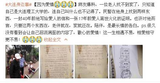 9月3日上午11點左右,新浪微博網(wǎng)友@大連成 發(fā)布了一條微博,引起了網(wǎng)友們的關(guān)注。微博寫道:一位老人找不到家了,只知道自己是大連理工大學(xué)的,連自己叫什么也不記得了。民警在他身上找到兩樣?xùn)|西,一封40年前他寫給愛人的信和一張17年前愛人離世的火化證明。