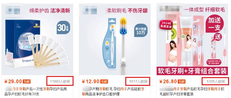市面上的月子牙刷不止這一種。記者在淘寶上搜索月子牙刷后發(fā)現(xiàn),除了紗布,還有海綿、硅膠制作的月子牙刷,以及刷頭很小很軟的類似兒童牙刷的月子牙刷。這些月子牙刷都賣得很好。評價則呈現(xiàn)兩極分化,有的消費者稱贊,軟軟的一點也不刺激,有的消費者則像陳女士一樣吐嘈,刷不干凈。