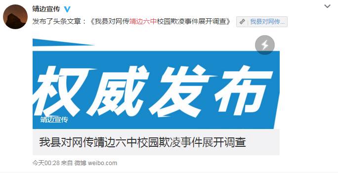 6月13日凌晨,靖邊縣委宣傳部官微發(fā)布通告,稱(chēng)縣教育局組織人員立即入校展開(kāi)調(diào)查,調(diào)查處理結(jié)果將及時(shí)全網(wǎng)公開(kāi)發(fā)布。