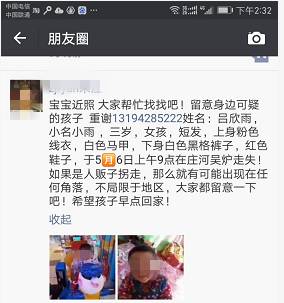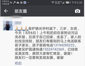 從2017年5月6日16時開始,一條尋人微信在莊河市民的微信朋友圈中廣泛流傳,信息如下:吳爐鎮(zhèn)光華村廟下,三歲,女孩,今天(5月6日)上午和奶奶在家附近河邊洗衣服,后孩子自己回家,走丟了,家人到處找沒找到,已經(jīng)核實真實性,麻煩大家?guī)兔D發(fā),謝謝!”