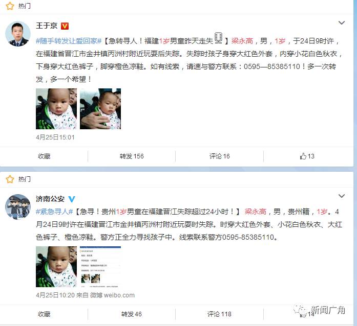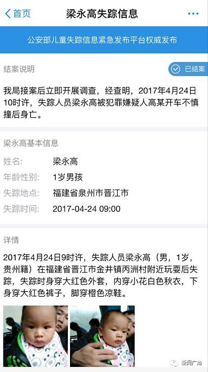 2017年4月24日上午10時許,晉江市公安局接群眾報警稱,其1歲多的兒子梁某高在晉江市金井鎮(zhèn)丙洲村附近失蹤。接報后,警方立即通過調(diào)取監(jiān)控錄像、進(jìn)村入戶走訪、發(fā)布懸賞通告等,全力尋找小男孩。經(jīng)查,警方抓獲犯罪嫌疑人高某(男,28歲,安徽人),當(dāng)天上午9時許,嫌疑人高某開車不慎撞到小男孩,并致其死亡。目前,案件正在進(jìn)一步偵查中。