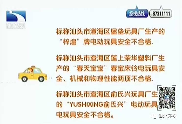標稱汕頭市澄海區(qū)俞氏興玩具廠生產(chǎn)的“YUSHIXING俞氏興”電動玩具車電玩具安全不合格。