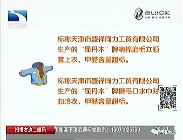 標稱天津市盛祥同力工貿(mào)有限公司生產(chǎn)的“顯丹木”牌精棉磨毛立領(lǐng)套上衣甲醛含量超標